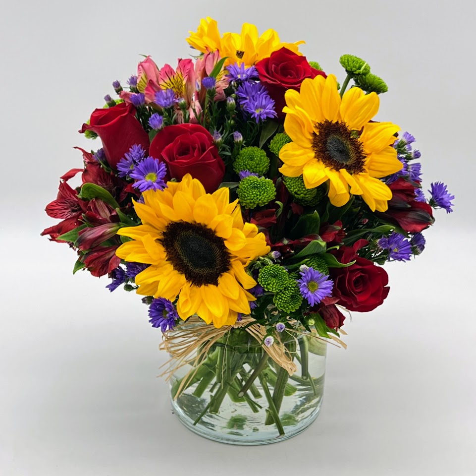 Reminiscent of strolling through a field of flowers, this colorful arrangement captures features magnificent sunflowers, alstroemeria and poms set in a trendy mason jar with a natural raffia bow.