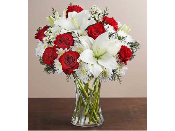 There’s a whole lot of holiday spirit in our charming bouquet. We’ve gathered a mix of blooms in classic Christmas colors, creating a thoughtful gift for the most wonderful time of the year.