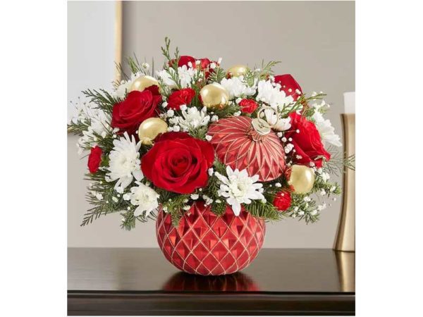 • All-around arrangement with red roses and mini carnations; white cushion poms; accented with baby’s breath, assorted Christmas greenery and decorative gold ornament balls